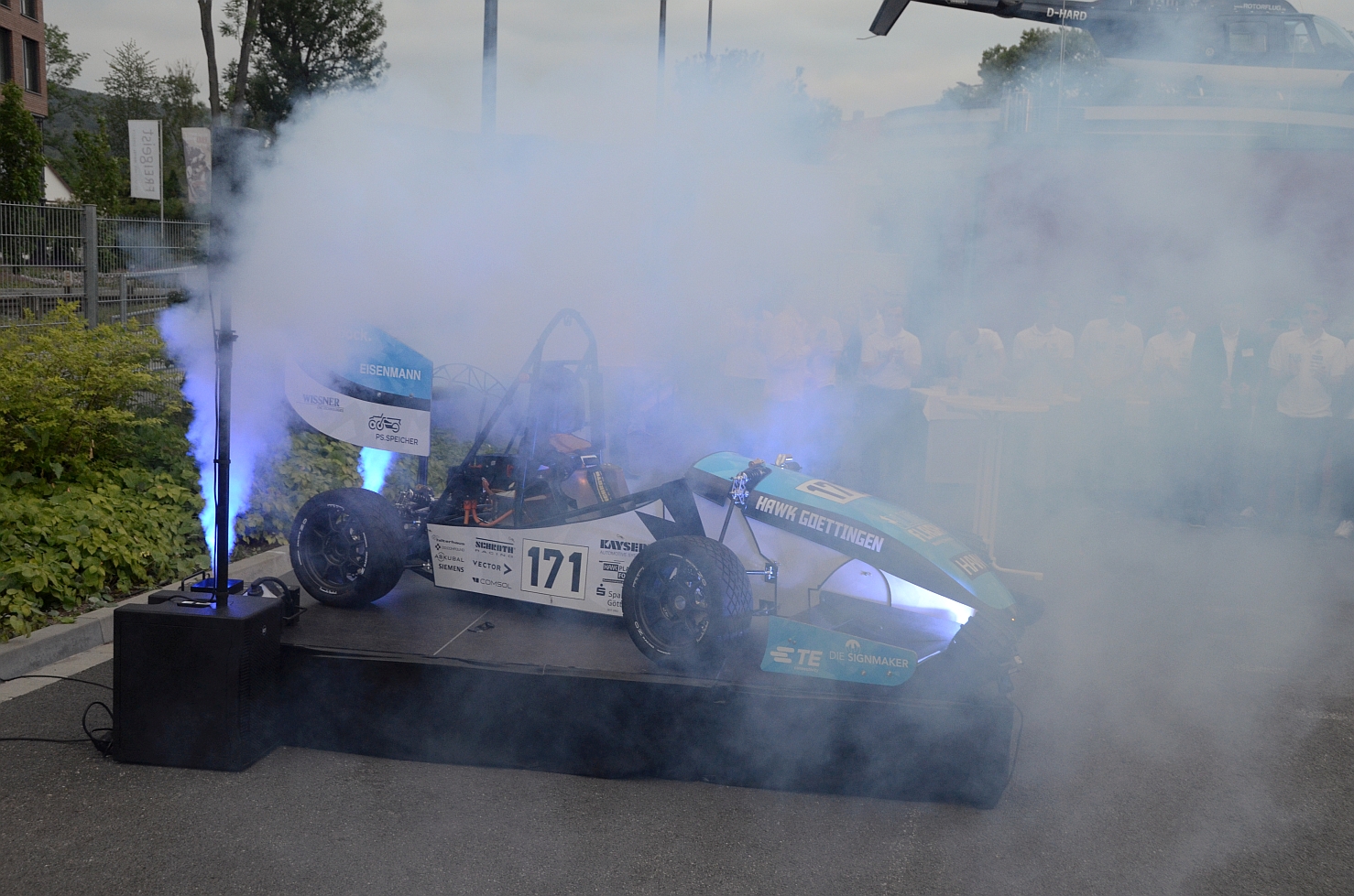 Gearbeitet worden sei sogar in Nachtschichten und bis zur letzten Minute. Sichtlich stolz auf das Team lobte Prof. Dr. Christopher Frey, Dekan der Göttinger HAWK-Fakultät Naturwissenschaften und Technik, den Einsatz und die Kreativität seiner angehenden Ingenieure und ihrer Kommilitonen aus den Fakultäten Ressourcenmanagement sowie Gestaltung am HAWK-Standort Hildesheim: „Mit Leidenschaft, Enthusiasmus und Freude wird gelernt“, fasste der Dekan die Erfahrungen des Blue Flash-Teams zusammen. Denn das wolle man mit dem Projekt Formula student erreichen: einen Rahmen, in dem man frei experimentieren könne und dabei lernen.