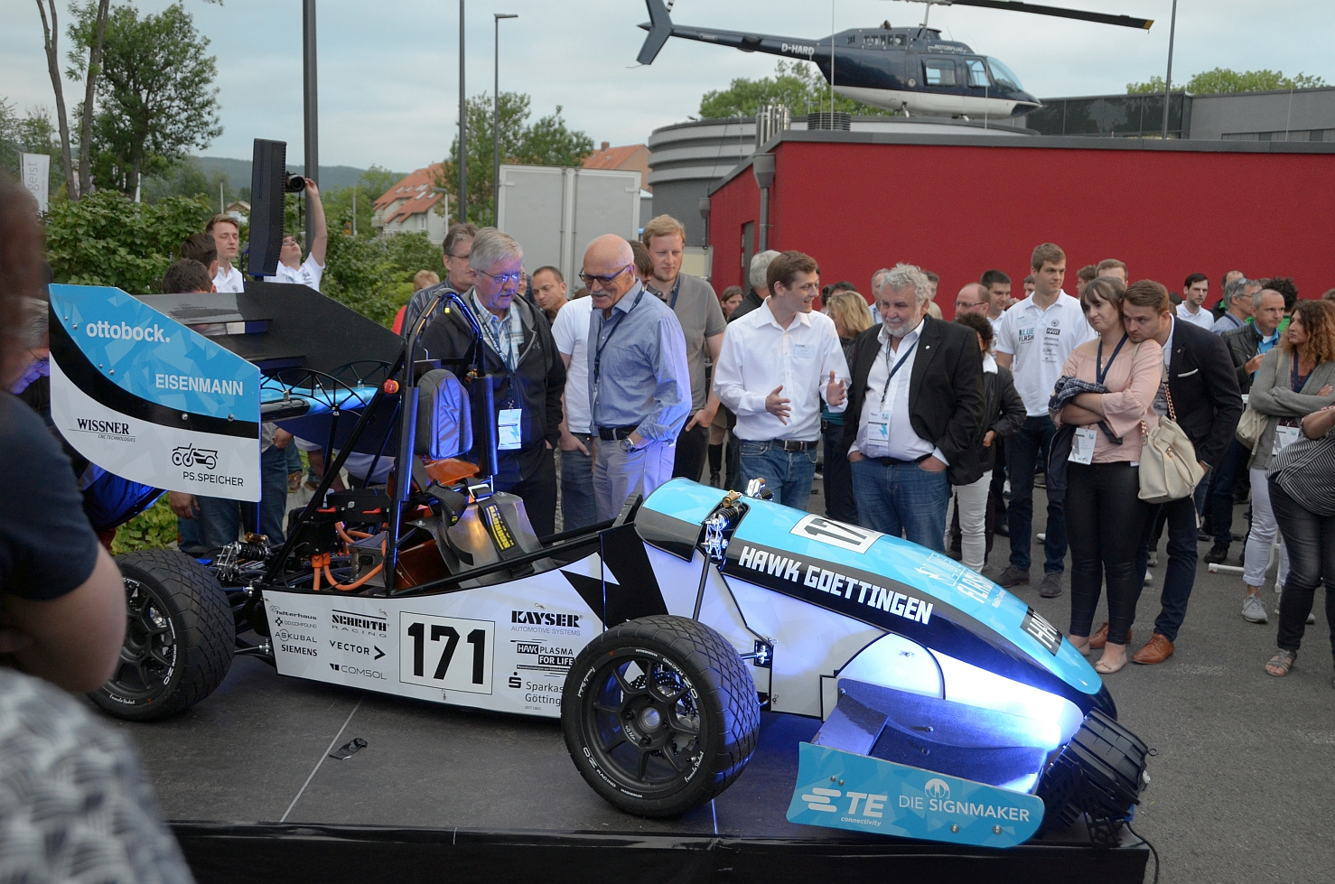 Sven Ehrich, Leiter der Forschung und Entwicklung beim Sponsor Ottobock, der mit vielen seiner Kolleg/inn/en angereist war, hob die sehr gute Zusammenarbeit mit dem studentischen Team hervor: „Ihr habt ein cooles Produkt und ihr habt gute Leute. Es ist toll, mit euch zusammenzuarbeiten.“ Die Leidenschaft der HAWK-Studenten hätte einen bleibenden Eindruck bei ihm und seinen rund 150 Kollegen hinterlassen, als die Studierenden bei Ottobock ihr Fahrzeug vorstellten. „Das muss man erstmals schaffen, die Fähigkeit zu begeistern.“
