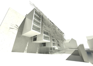 „Wir gehen davon aus, dass unsere Generation nichts mehr erben wird – vielmehr wird das Leben geprägt sein vom Umziehen“, resümieren die Ingenieurinnen. Entsprechend fällt ihr Entwurf aus. Die sogenannte Parasit-Architektur – es wird an bestehende Gebäude angebaut, weil es an freiem Platz mangelt – basiert auf vier Komponenten: einer dicken Mauer, vor der Kuben zu schweben scheinen. Dahinter liegt ein Laubengang. Unten dominiert eine Glashalle. Prägend sind ineinander verzweigte Stahlstäbe vor der Fassade, die die dynamischen und spontanen Vernetzungen innerhalb des Gebäudes versinnbildlichen sollen. Der Materialmix zeigt Beton, Estrich, Glas und Stahl. Hier gibt es keine eigenen Wohnzimmer mehr. Vielmehr ist das Gebäude unterteilt in öffentliche, halböffentliche und private Komplexe mit fließenden Grenzen unterteilt. Die für alle zugänglichen Gemeinschaftsräume und Aktiv-Bereiche führen in die Küchen als Pufferzone, von dort aus in halböffentliche Loggien bis hin ins persönliche, private Schlafgemach.