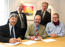 Vertragsunterzeichnung ? Professor Karl-Josef Schalz (HAWK, Mitte) mit v.l. sitzend, Oberstudiendire