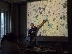 Andreas Buder, HKB Bern, erläutert das mikroskopische Bild von natürlichem Malachit. (HAWK