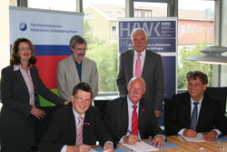 Michael Koch, Hauptgeschäftsführer der Landesvertretung der Handwerkskammern Niedersachsen, bteonte bei der Unterzeichnung der Kooperationsvereinbarung in den Räumen der Handwerkskammer in Hildesheim: „Uns ist wichtig, dass die in Niedersachsen für Gesellen (Gesellenprüfung + 3 Jahre Berufserfahrung = fachbezogene Hochschulzugangsberechtigung) und Meister (= allgemeine Hochschulzugangsberechtigung) gegebenen Zulas-sungskriterien für ein Studium erfüllt werden und die Studenten über ein fundiertes Basiswissen verfügen. Dabei möchten wir aber verhindern, dass es zu Dopplungen in der Wissensvermittlung kommt. Dies ist im direkten Abgleich der Inhalte und nach Einschätzung der Dozenten der Hochschule und unseren Ausbildern der Meisterkurse mehr als gelungen.“