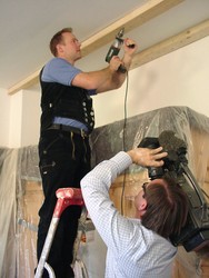 Bergs Verfahren klingen im Ingenieurvokabular ein wenig sperrig: Das Prinzip der „Unterspannten Holzbalkendecke (UHB)“ und der „Holz-unterspannten Ziegeldecke (HUZ)“ ist aber ebenso verständlich wie wirkungsvoll. Dieser Ansicht war jetzt auch die Redaktion der MDR-Fernsehsendung „Einfach genial“, die ein Drehteam nach Hildesheim geschickt hat, um die Montage der „Holz-unterspannten Ziegeldecke“ in Enzo Iacovozzis Wohnung für die Sendung zu filmen. Wohl gemerkt, für einen zweiten Beitrag, denn schon im Januar 2005 hatte „Einfach genial“ über die „Unterspannte Holzbalkendecke“ berichtet und ein bundesweites Echo bei Prof. Berg ausgelöst.