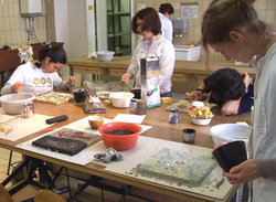 Praktisch ergründet werden sollten die künstlerischen und die materialwissenschaftlichen Grundlagen von Mosaiken: So waren die Aufgaben für die Studierenden, Mosaike mit kleinen und großen Teilen zu entwerfen, die Glasuren herzustellen, aufzubringen und zu brennen. Schließlich sollte alles auf einen festen Träger geklebt und dann verfugt werden. Parallel dazu wurden Messungen über die Aufnahmefähigkeit des Grundtons und über die Entwicklung der Glasuren durch die weitere Verarbeitung durchgeführt – zum Verständnis der naturwissenschaftlichen Grundlagen.