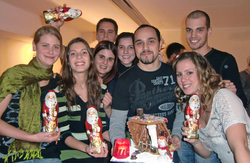 Und schließlich ermöglichten noch die mexikanischen Studentinnen einen Einblick in ihre heimischen Weihnachtsbräuche, bei denen eine Piñata nicht fehlen darf. Sie hatten für den Abend eine stattliche Piñata, eine innen hohle Figur aus Pappmaché, gebaut. Deren Zerschlagung (in der Regel mit verbundenen Augen und einem Stock in der Hand) stellt den Sieg über die sieben Todsünden dar und wird mit reichlich Süßigkeiten aus dem Innern belohnt. Das ließen sich die Studierenden nicht zweimal sagen und schlugen unter großem Beifall kräftig zu.