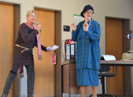 Um die Unterschiede zwischen damals und heute auch wirklich allen deutlich zu machen, hatte das Gleichstellungsbüro keine Mühen gescheut und eine Tippse alten Schlages zu Demonstrationszwecken ins Goschentor eingeladen: Elfriede Knörrich alias Elisa Salamanca als sangesfreudige Sekretärin im Un-Ruhestand. Stimmgewaltig erklärte sie ihre innige Liebe zur mechanischen Schreibmaschine am eigens aufgebauten historischen Büroschreibtisch. Höchst anschaulich besang sie auch leichtfertiges Treiben im Büro von damals mit dem Song „Die Chefin ist weg“, das allerdings jäh ein Ende fand. Die Chefin erschien nämlich wider Erwarten zu früh: Ingrid Haasper besang bühnenreif die Freude über die „artigen“ Untergebenen.