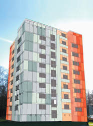 „Pixel“ heißt der Vorschlag von Janina Conrady, der sich stark an den vorhandenen Fassadenelementen orientiert und dadurch ein neues Bild aus einem bereits vorhandenen Muster entstehen lässt. „Bei der Farbgebung habe ich mich für Orange-, Rot- und helle Grautöne entschieden“, so die Gewinnerin. „Dieses Farbkonzept sorgt später für spannungsvolle Kontraste auf der Fassade.“
