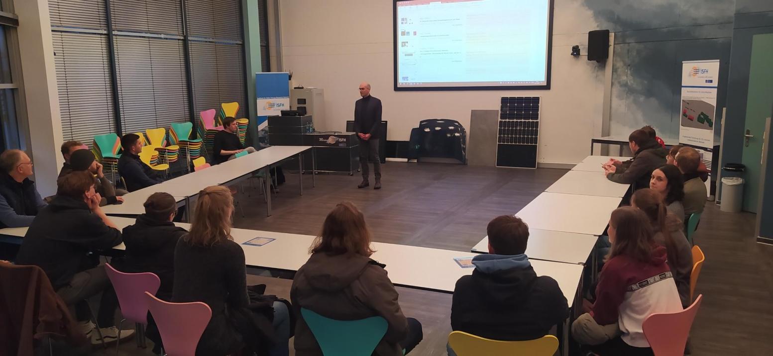 Am dritten Tag der Exkursion besuchten die Studierenden das Institut für Solarenergieforschung Hameln (ISFH). Dort erhielten sie Einblicke in die Entwicklung zukunftsweisender solarer Technologien, wie innovative Fassadensysteme, PV-Zellen in Steinoptik, photovoltaisch-thermische Kollektoren und neuartige Speicher- sowie Wärmepumpensysteme.